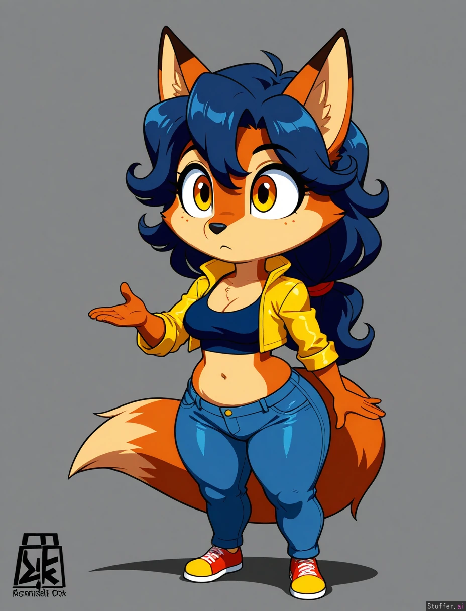 8k, uhd, best quality, high rating, anatomically correct, perfect anatomy, (detailed face), simple background, ((cel shading)), lighting, full body pose, (detailed eyes), big eyes, beautiful eyes, no humans, furry, female, solo, solo female, 1girl, alone, (carmelita fox), small nose, amber eyes, yellow jacket, blue tank top, cropped_jacket, midriff, jeans, thick thighs,