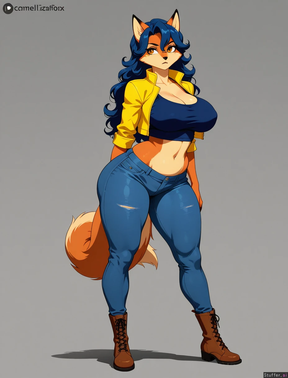 8k, uhd, best quality, high rating, anatomically correct, perfect anatomy, (detailed face), simple background, (cel shading), lighting, full body pose, (detailed eyes), big eyes, beautiful eyes, no humans, furry, female, solo, solo female, 1girl, alone, (carmelita fox), mature female, tall, small nose, amber eyes, yellow jacket, blue tank top, cropped_jacket, midriff, jeans, thick thighs, wide hips, wide ass, serious, boots,