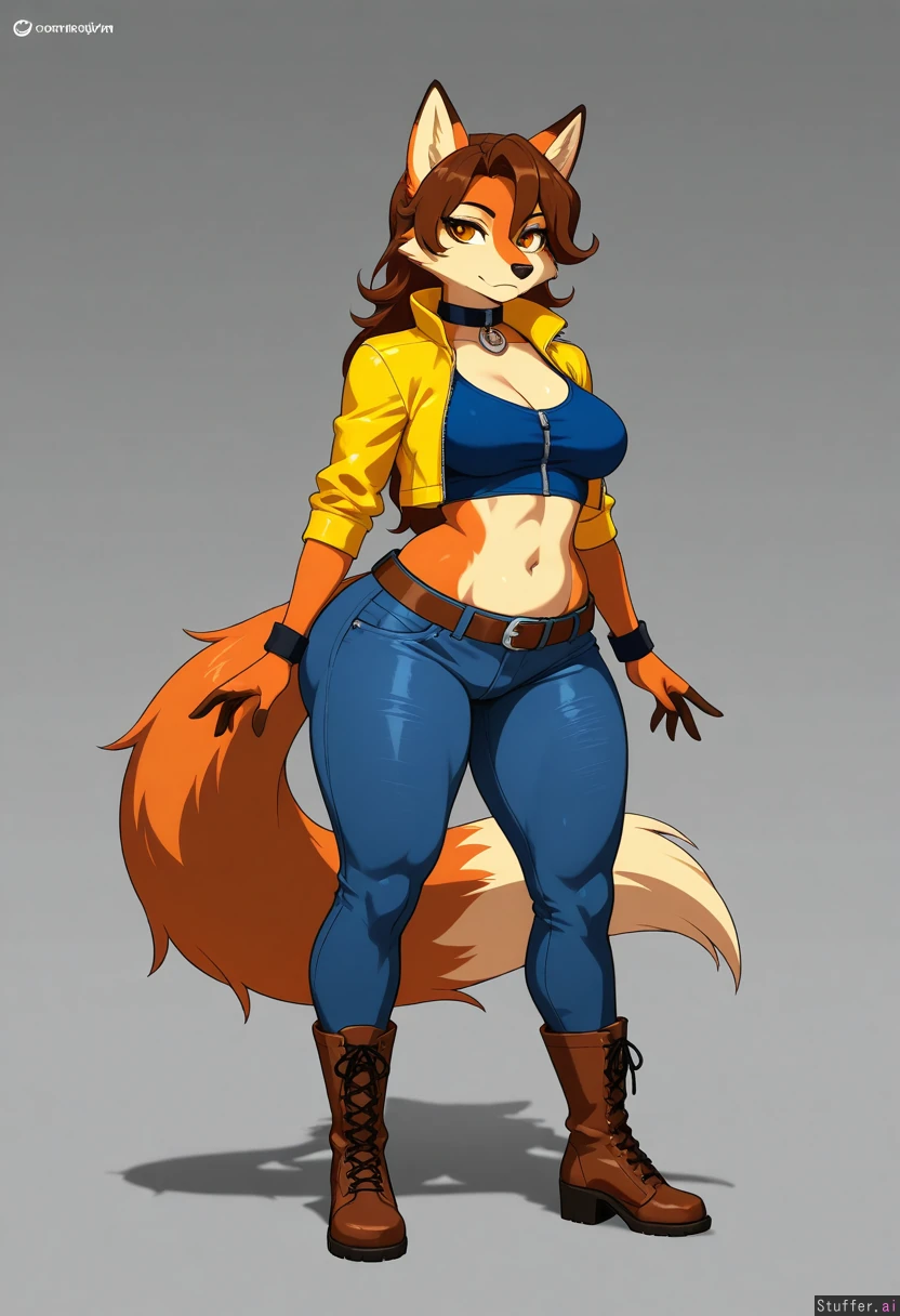 8k, uhd, best quality, high rating, anatomically correct, perfect anatomy, (detailed face), simple background, (cel shading), lighting, full body pose, (detailed eyes), big eyes, beautiful eyes, no humans, kuru_tyan(artist), furry, female, solo, solo female, 1girl, alone, carmelita fox, mature female, tall, tall female, amber eyes, yellow jacket, blue tank top, cropped_jacket, midriff, jeans, thick thighs, wide hips, wide ass, serious, boots, belt, collar, zipper top, medium breasts, bottomheavy,