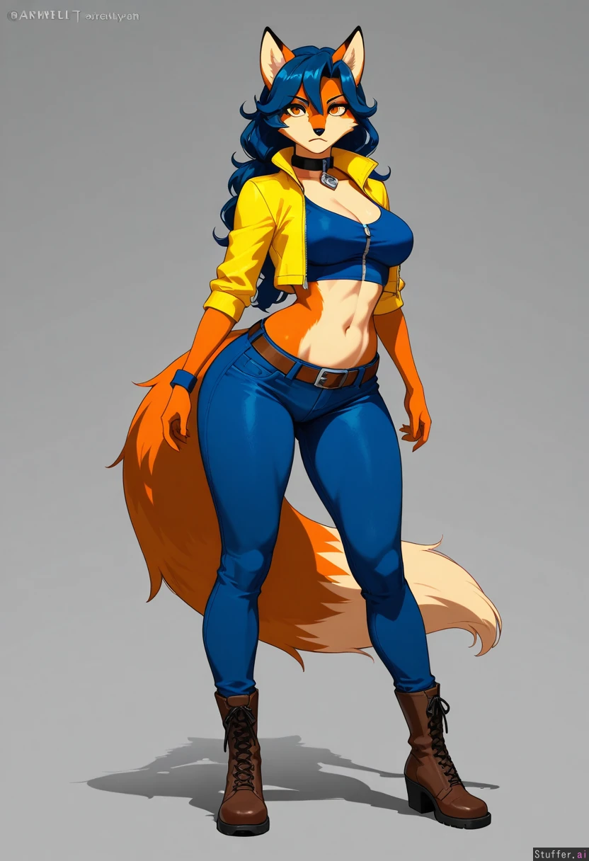 8k, uhd, best quality, high rating, anatomically correct, perfect anatomy, (detailed face), simple background, (cel shading), lighting, full body pose, (detailed eyes), big eyes, beautiful eyes, no humans, kuru_tyan(artist), furry, female, solo, solo female, 1girl, alone, (carmelita fox), mature female, tall, tall female, amber eyes, yellow jacket, blue tank top, cropped_jacket, midriff, jeans, wide hips, tight ass, (serious expression), boots, belt, collar, zipper top, medium breasts, bottomheavy,
