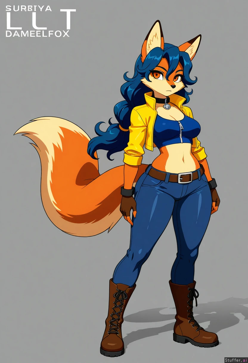 8k, uhd, best quality, high rating, anatomically correct, perfect anatomy, (detailed face), simple background, (cel shading), lighting, full body pose, (detailed eyes), big eyes, beautiful eyes, no humans, kuru_tyan(artist), furry, female, solo, solo female, 1girl, alone, (carmelita fox), mature female, tall, tall female, amber eyes, yellow jacket, blue tank top, cropped_jacket, midriff, jeans, wide hips, tight ass, serious expression, boots, belt, collar, zipper top, medium breasts, bottomheavy,