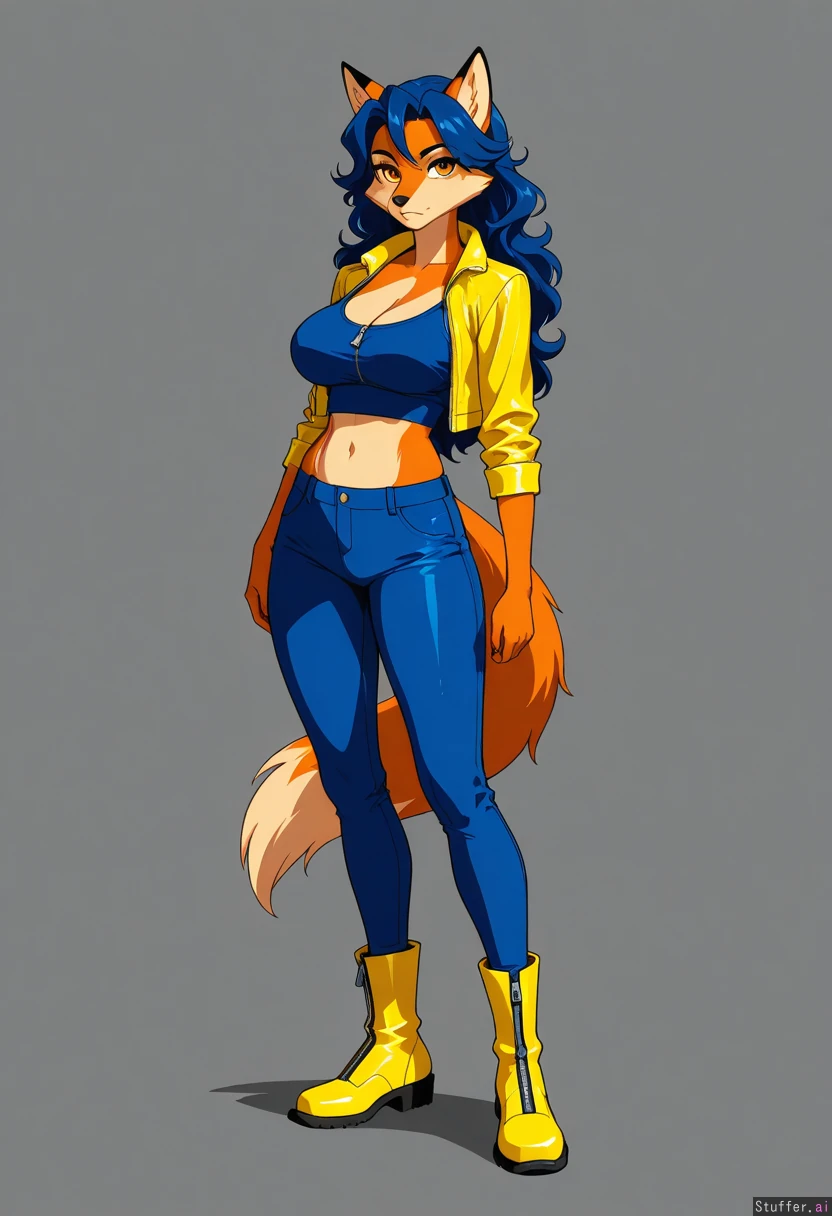 8k, uhd, best quality, high rating, anatomically correct, perfect anatomy, (detailed face), simple background, cel shading, lighting, full body pose, (detailed eyes), big eyes, beautiful eyes, no humans, kuru tyan(artist), furry, female, solo, alone, solo female, 1girl, carmelita fox, tall, mature female, serious, cropped yellow jacket, blue tank top, zipper, midriff, blue pants, yellow boots, bottomheavy,