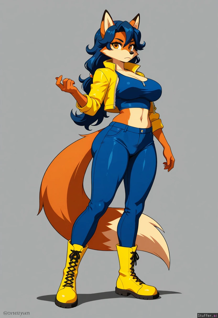 8k, uhd, best quality, high rating, anatomically correct, perfect anatomy, (detailed face), simple background, cel shading, lighting, full body pose, detailed eyes, big eyes, beautiful eyes, no humans, amber eyes, kuru tyan(artist), furry, female, solo, alone, solo female, 1girl, carmelita fox, tall, mature female, serious, cropped yellow jacket, blue tank top, zipper, midriff, blue pants, yellow boots, bottomheavy, round thighs, wide ass,