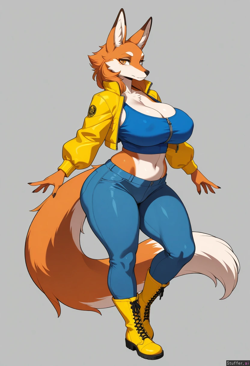 8k, uhd, best quality, high rating, anatomically correct, perfect anatomy, (detailed face), simple background, cel shading, lighting, full body pose, detailed eyes, big eyes, beautiful eyes, no humans, amber eyes, kuru tyan(artist), cervina7(artist), furry, female, solo, alone, solo female, 1girl, carmelita fox, tall, mature female, serious, cropped yellow jacket, blue tank top, zipper, midriff, blue pants, yellow boots, bottomheavy, round thighs, wide ass,