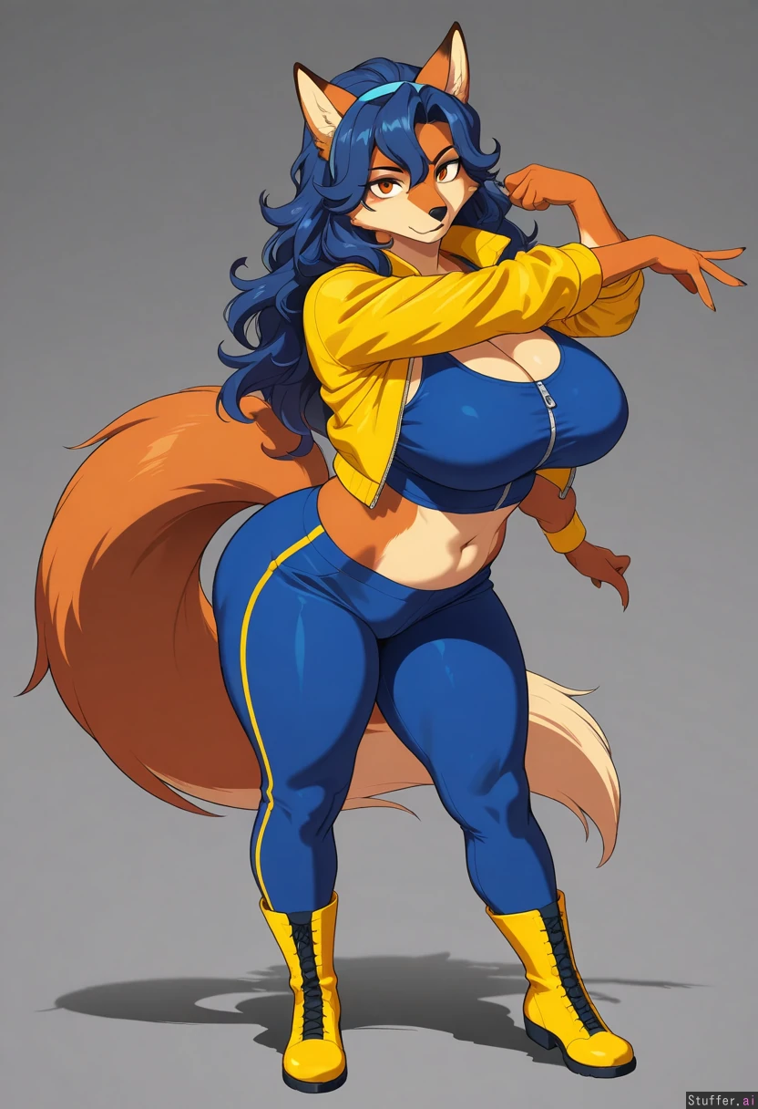 8k, uhd, best quality, high rating, anatomically correct, perfect anatomy, (detailed face), simple background, cel shading, lighting, full body pose, detailed eyes, big eyes, beautiful eyes, no humans, amber eyes, kuru tyan(artist), cervina7(artist), furry, female, solo, alone, solo female, 1girl, (carmelita fox), tall, mature female, serious, blue hair, cropped yellow jacket, blue tank top, zipper, midriff, blue pants, yellow boots, bottomheavy, round thighs, wide ass,