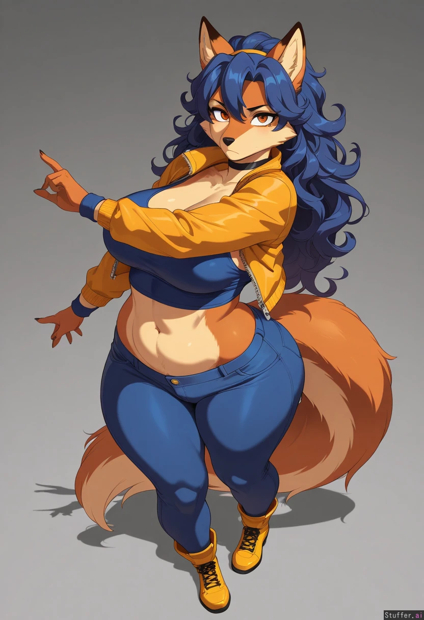 8k, uhd, best quality, high rating, anatomically correct, perfect anatomy, (detailed face), simple background, cel shading, lighting, full body pose, detailed eyes, big eyes, beautiful eyes, no humans, amber eyes, kuru tyan(artist), cervina7(artist), furry, female, solo, alone, solo female, 1girl, (carmelita fox), tall, mature female, serious, curly blue hair, orange fur, tan stomach, cropped yellow jacket, blue tank top, zipper, midriff, blue pants, yellow boots, bottomheavy, round thighs, wide ass,