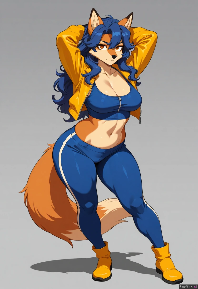 8k, uhd, best quality, high rating, anatomically correct, perfect anatomy, (detailed face), simple background, cel shading, lighting, full body pose, detailed eyes, big eyes, beautiful eyes, no humans, amber eyes, kuru tyan(artist), cervina7(artist), furry, female, solo, alone, solo female, 1girl, (carmelita fox), tall, mature female, serious, curly blue hair, orange fur, tan stomach, cropped yellow jacket, blue tank top, zipper, midriff, blue pants, yellow boots, bottomheavy, round thighs, wide ass, medium breasts,