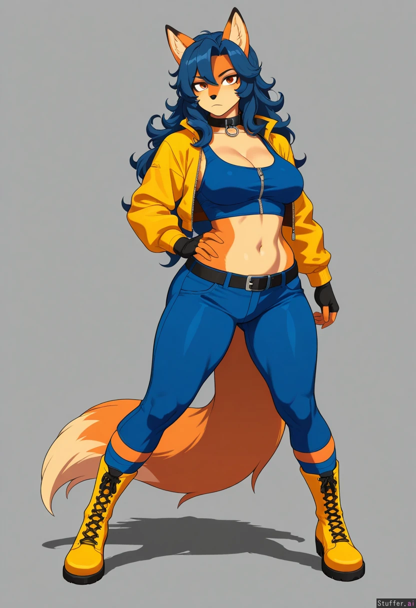 8k, uhd, best quality, high rating, anatomically correct, perfect anatomy, (detailed face), simple background, cel shading, lighting, full body pose, (detailed eyes), big eyes, beautiful eyes, no humans, amber eyes, kuru tyan(artist), cervina7(artist), furry, female, solo, alone, solo female, 1girl, (carmelita fox), tall, mature female, serious, curly blue hair, orange fur, tan stomach, cropped yellow jacket, blue tank top, zipper shirt, midriff, blue pants, belt, yellow boots, bottomheavy, round thighs, wide ass, medium breasts, collar,