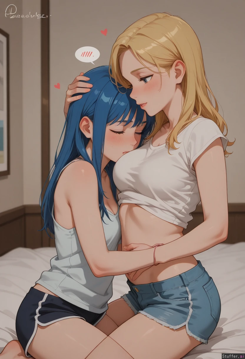 Lesbian_couple, yuri, grabbing_belly, horny, aroused, blue_hair, blonde_hair, (pregnant_belly: 0.5)