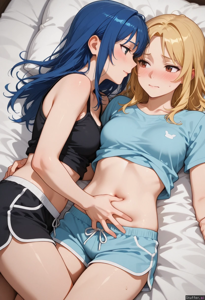 Lesbian_couple, yuri, grabbing_belly, turned_on, embarrassed, (blue_hair), ((blonde_hair)), (chubby_belly: 0.0), ((pregnant: 0.4))