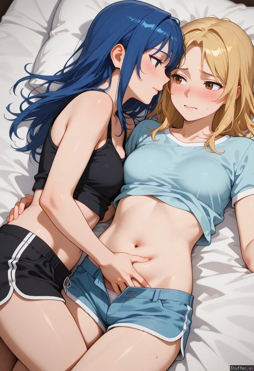 Lesbian_couple, yuri, grabbing_belly, turned_on, embarrassed, (blue_hair), ((blonde_hair)), (chubby_belly: 0.1), ((pregnant: 0.6))