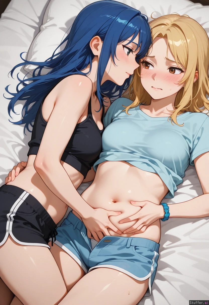 Lesbian_couple, yuri, grabbing_belly, turned_on, embarrassed, (blue_hair), ((blonde_hair)), (chubby_belly: 0.4), ((pregnant: 0.6))