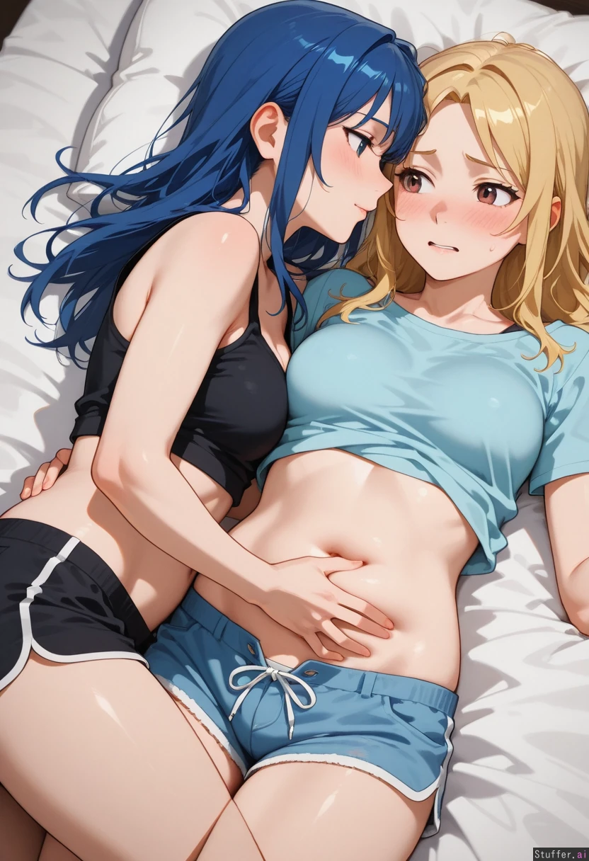 Lesbian_couple, yuri, grabbing_belly, turned_on, embarrassed, (blue_hair), ((blonde_hair)), (chubby_belly: 0.6), ((pregnant: 0.0))