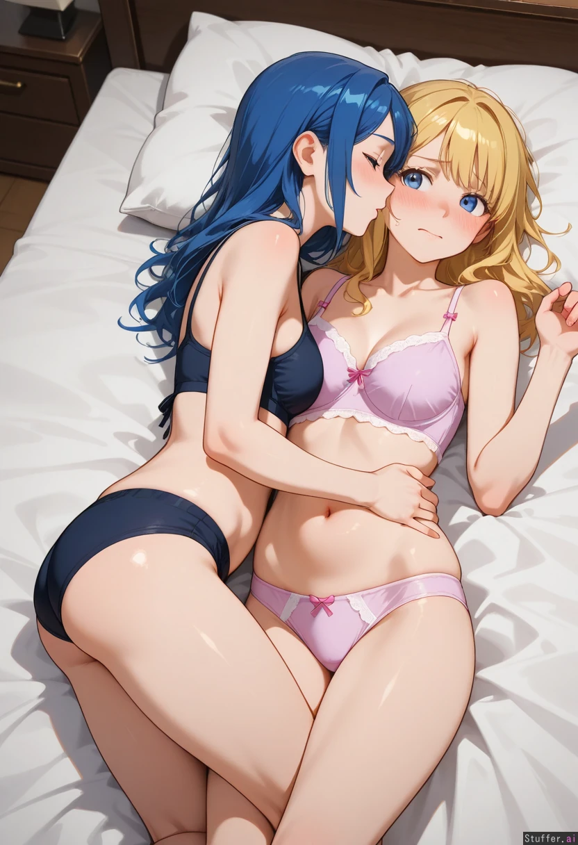 Lesbian_couple, yuri, grabbing_belly, turned_on, embarrassed, (blue_hair), ((blonde_hair)), (chubby_belly: 0.5), ((pregnant_belly: 0.0))
