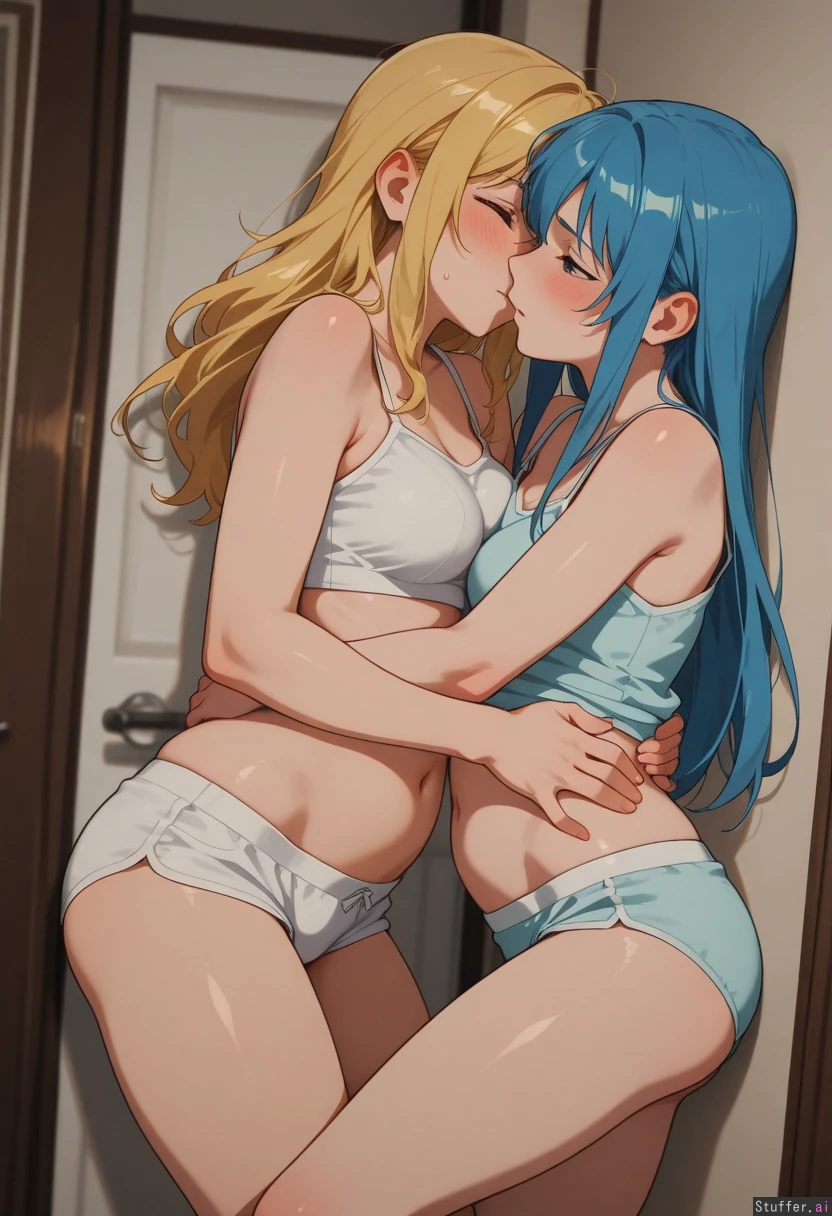 Lesbian_couple, yuri, grabbing_belly, turned_on, embarrassed, (blue_hair), ((blonde_hair)), (chubby_belly: 0.0), ((pregnant_belly: 0.4))