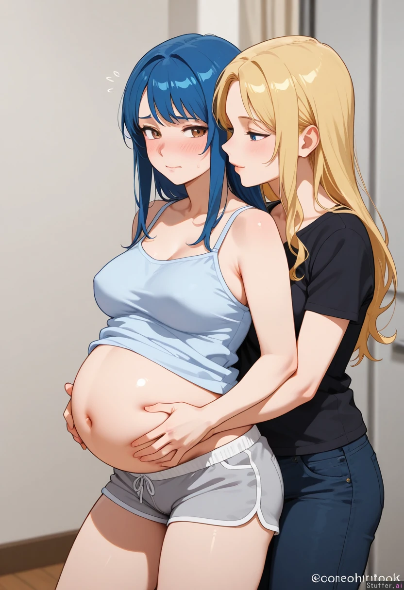 Lesbian_couple, yuri, grabbing_belly, turned_on, embarrassed, (blue_hair), ((blonde_hair)), (chubby_belly: 0.2), ((pregnant_belly: 0.7))