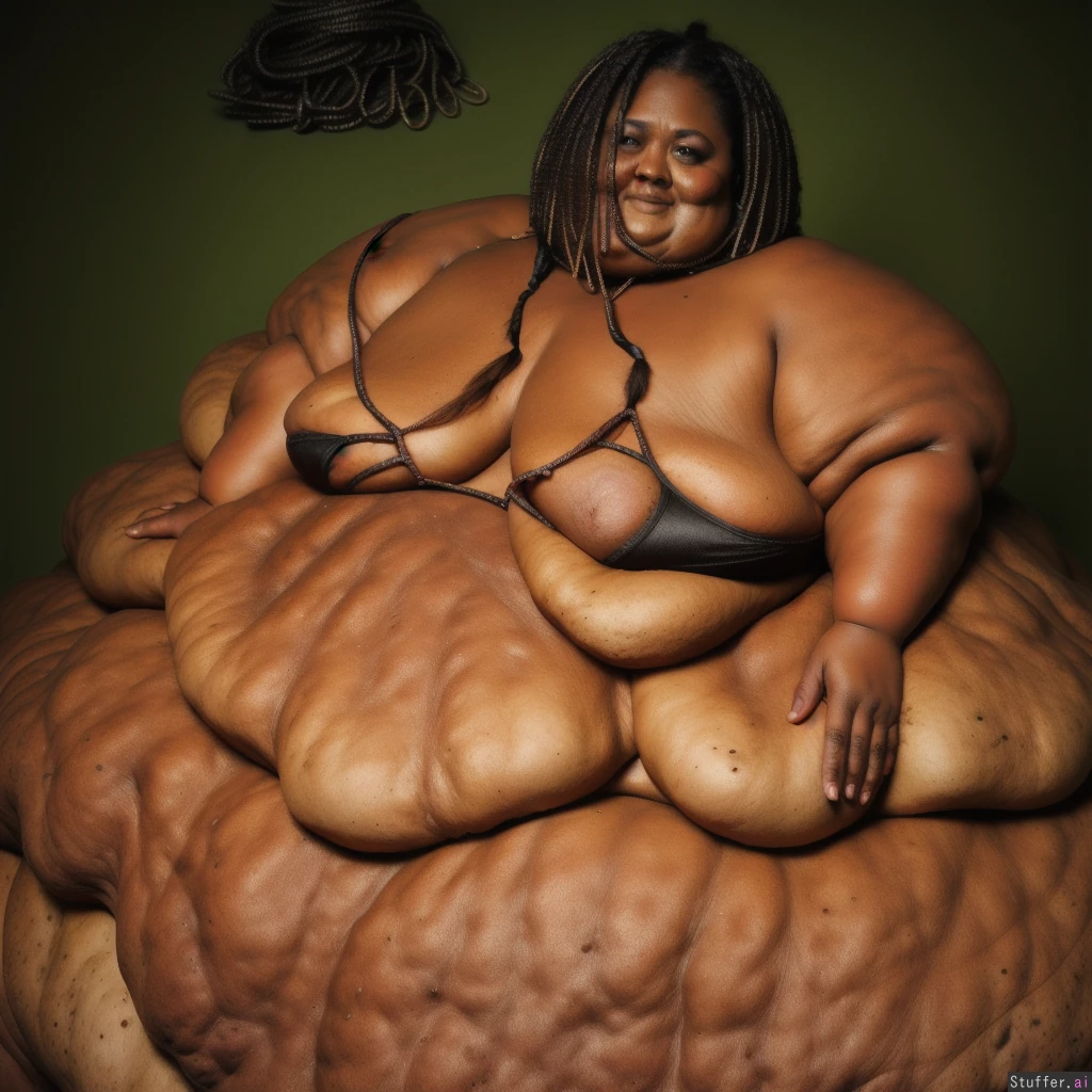 masterpiece, best quality, score_7. Photo realistic, ultra high quality, african ssbbw, extremely fat blob, beautiful face:1.4, (ultra double chin:1.9), (ultra fat face:1.9), ultra huge legs:1.9), (ultra huge arms:1.9), black braided hair:1.4 , wearing a red bra