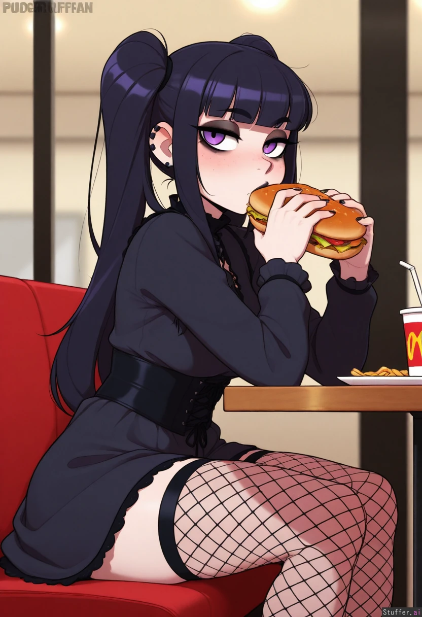 Beautiful shading, highly detailed, best quality, perfect anatomy, perfect proportions, perfect lighting, (best quality), (high rating), absurd res, high res, detailed, ultra quality, ((high quality)), masterpiece, (ultra high resolution), stunning beauty, detailed face, intricate detail, sophisticated detail,high quality, (masterpiece), flat colors, vanripper(artist), pudgeruffian(artist), krekkov(artist) 1girl, exquisite detail, absurd resolution, correct anatomy, 8k, (highly detailed face), goth girl, purple twintails, black lipstick, purple eyes, black corset, black dress, fishnet stockings, McDonalds, sitting at table, eating, (obese:0.5)
