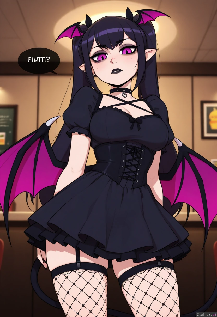 Beautiful shading, highly detailed, best quality, perfect anatomy, perfect proportions, perfect lighting, (best quality), (high rating), absurd res, high res, detailed, ultra quality, ((high quality)), masterpiece, (ultra high resolution), stunning beauty, detailed face, intricate detail, sophisticated detail,high quality, (masterpiece), flat colors, vanripper(artist), pudgeruffian(artist), krekkov(artist) 1girl,exquisite detail, absurd resolution, correct anatomy, 8k, (highly detailed face), goth girl, purple twintails, black lipstick, purple eyes, black corset, black dress, fishnet stockings, McDonalds, ((Succubus))