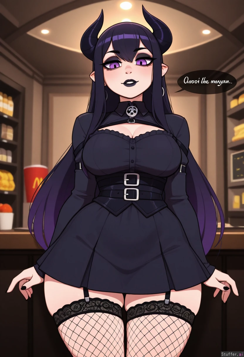 Beautiful shading, highly detailed, best quality, perfect anatomy, perfect proportions, perfect lighting, (best quality), (high rating), absurd res, high res, detailed, ultra quality, ((high quality)), masterpiece, (ultra high resolution), stunning beauty, detailed face, intricate detail, sophisticated detail,high quality, (masterpiece), flat colors, vanripper(artist), pudgeruffian(artist), krekkov(artist) 1girl,exquisite detail, absurd resolution, correct anatomy, 8k, (highly detailed face), goth girl, wavy_black_hairs, black lipstick, purple eyes, black corset, black dress, fishnet stockings, McDonalds, ((Demon_girl)) ((Lamb_horns)) ((curvy_goth_mommy)) ((wide_hips)) ((thick_lips))