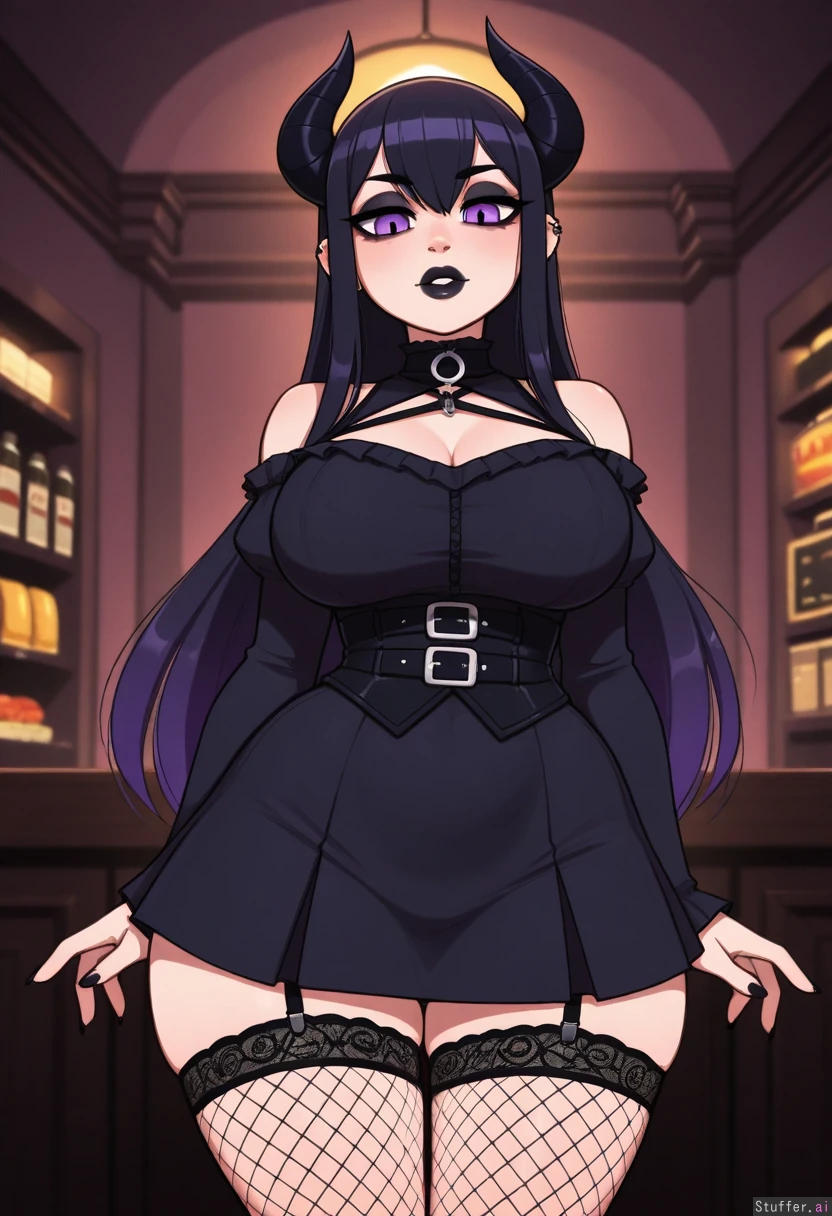 Beautiful shading, highly detailed, best quality, perfect anatomy, perfect proportions, perfect lighting, (best quality), (high rating), absurd res, high res, detailed, ultra quality, ((high quality)), masterpiece, (ultra high resolution), stunning beauty, detailed face, intricate detail, sophisticated detail,high quality, (masterpiece), flat colors, vanripper(artist), pudgeruffian(artist), krekkov(artist) 1girl,exquisite detail, absurd resolution, correct anatomy, 8k, (highly detailed face), goth girl, wavy_black_hairs, black lipstick, purple eyes, black corset, black dress, fishnet stockings, McDonalds, ((Demon_girl)) ((Lamb_horns)) ((curvy_goth_mommy)) ((wide_hips)) ((thick_lips)) ((sensitive_lips))