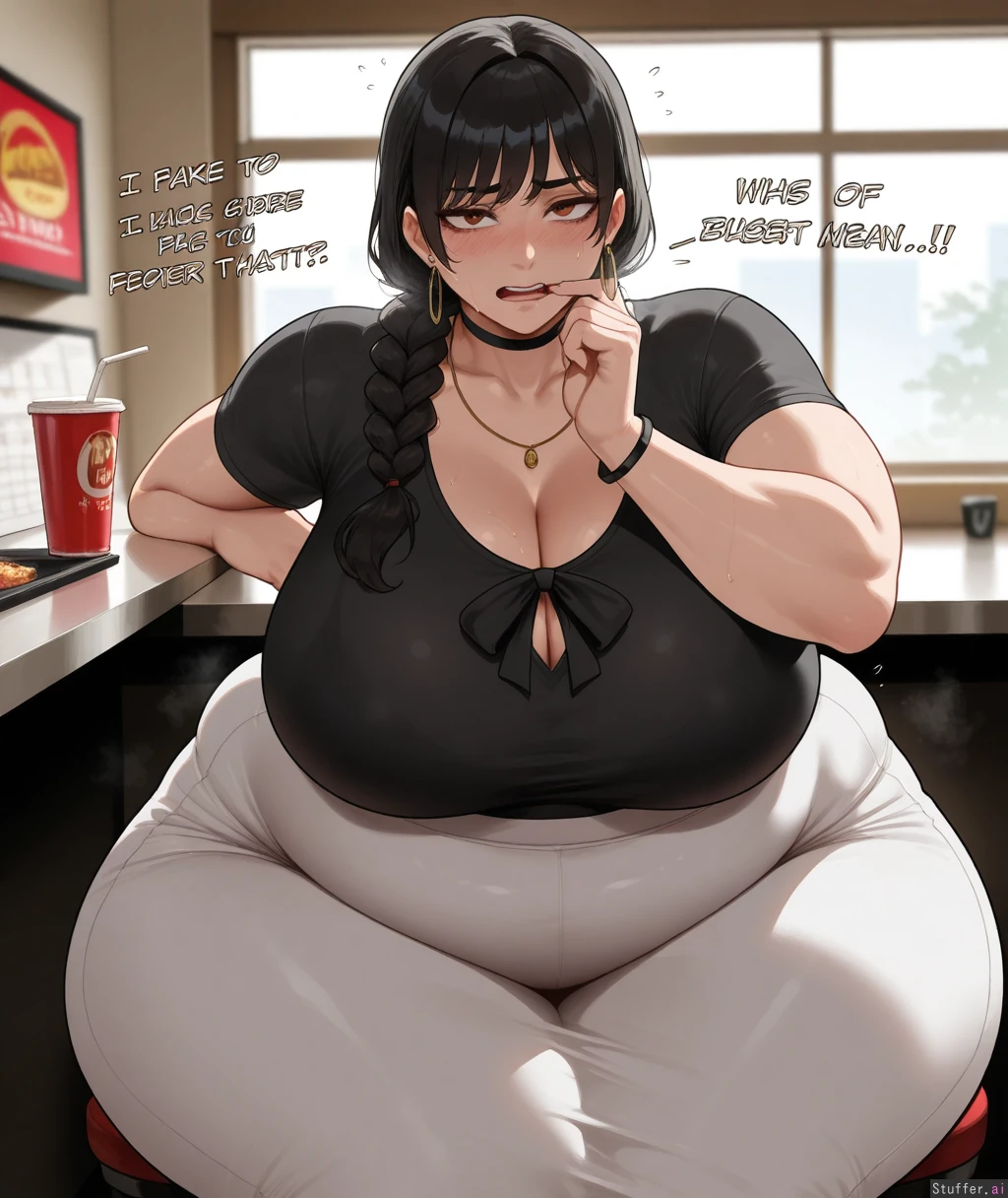 ((Solo, 1 woman)), ((nyantcha)))), (krekkov), c.cu(artist), araneesama(artist), 8k, high resolution, gorgeous, masterpiece, ((flawless)), (((high rating))), ((highly detailed face)), beautiful face, ((((fat female)))), ((((thick milf)))), (((steamy))), (((skindentation))), (((Office girl))), ((())), ((((solo_female)))), (()), ((((Yoru from chainsaw man)))), (((black blouse, white long skirt, jewelry))), (()), ((())), (()), (((Morbidly obese:1.4))), ((massive breasts)), ((massive thighs)), ((wide hips)), fat arms, ((voluptuous)), ((huge fat ass)), sweaty, (((Sexy, seductive))), (((((burping, embarrassed))))), in fast food restaurant, looking at viewer, sitting,