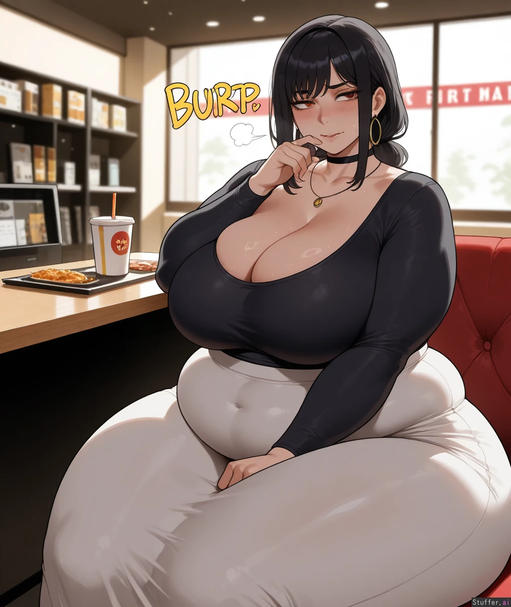 ((Solo, 1 woman)), ((nyantcha)))), (krekkov), c.cu(artist), araneesama(artist), 8k, high resolution, gorgeous, masterpiece, ((flawless)), (((high rating))), ((highly detailed face)), beautiful face, ((((fat female)))), ((((thick milf)))), (((steamy))), (((skindentation))), (((Office girl))), ((())), ((((solo_female)))), (()), ((((Yoru from chainsaw man)))), (((black blouse, white long skirt, jewelry))), ((Cleavage)), ((())), (()), (((Morbidly obese:1.4))), ((massive breasts)), ((massive thighs)), ((wide hips)), fat arms, ((voluptuous)), ((huge fat ass)), sweaty, (((Sexy, seductive))), (((((burping, embarrassed))))), in fast food restaurant, looking at viewer, sitting,