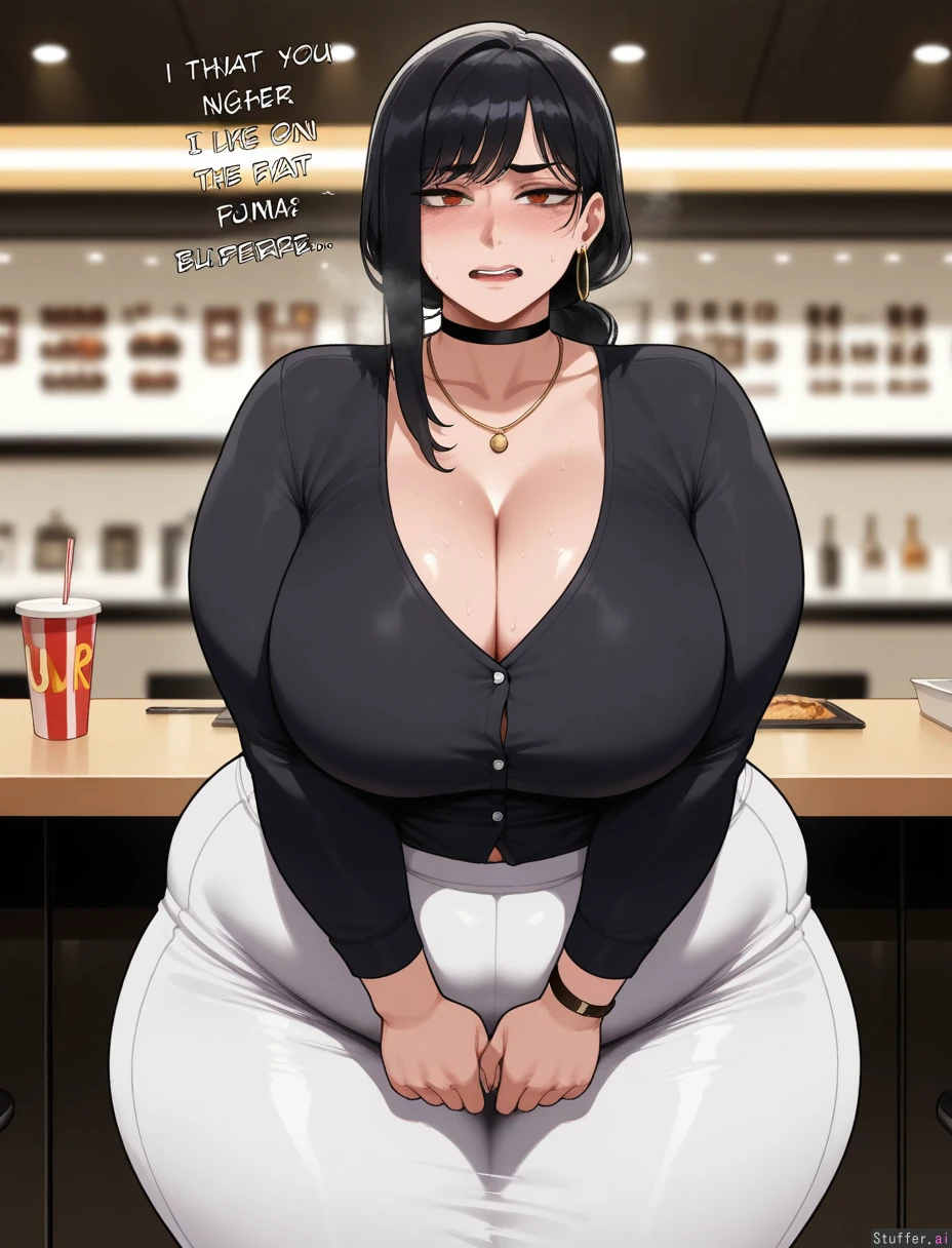 ((Solo, 1 woman)), ((nyantcha)))), (krekkov), c.cu(artist), araneesama(artist), 8k, high resolution, gorgeous, masterpiece, ((flawless)), (((high rating))), ((highly detailed face)), beautiful face, ((((fat female)))), ((((thick milf)))), (((steamy))), (((skindentation))), (((Office girl))), ((())), ((((solo_female)))), (()), ((((Yoru from chainsaw man)))), (((black blouse, white long skirt, jewelry))), ((Cleavage)), ((())), (()), (((Morbidly obese:1.4))), ((massive breasts)), ((massive thighs)), ((wide hips)), fat arms, ((voluptuous)), ((huge fat ass)), sweaty, (((Sexy, seductive))), (((((burping, embarrassed))))), in fast food restaurant, looking at viewer,