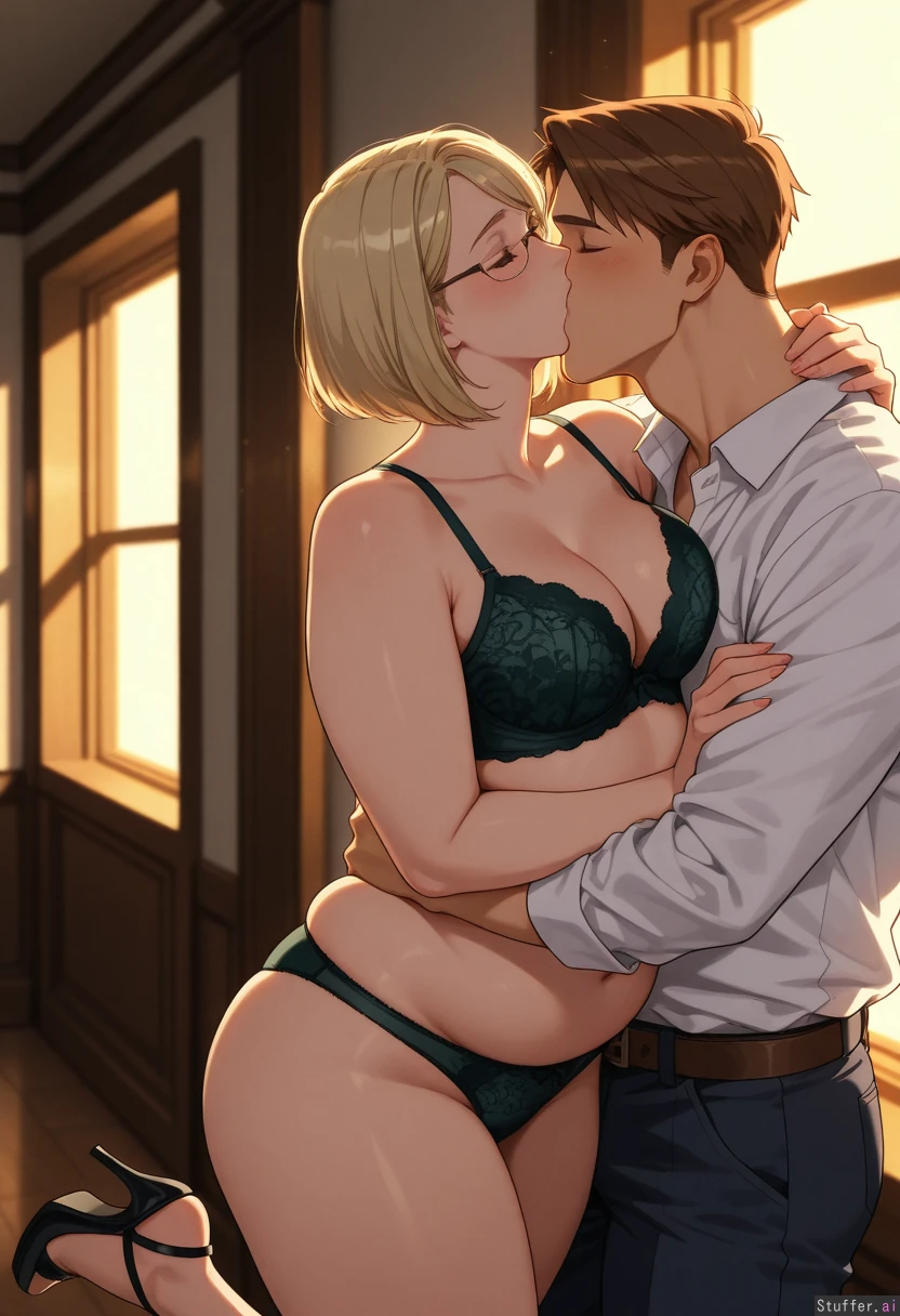 Tall, mature, sexy, blonde inverted bob, side-swept bangs, hazel eyes, wide jawline, medium breasts, very chubby belly, very wide hips, plump thighs, hip dips, Wearing dark green lace bra and panties, heels, sexy glasses, Moody lighting, warm light, romantic setting, (Handsome boyfriend embracing her, kissing her neck:1.6))