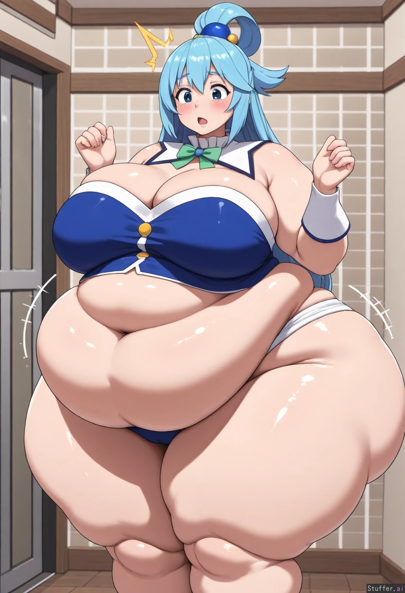 uhd, high resolution, flawless, best_quality, (hdr), (lineless:1.4), perfect anatomy, beautiful face, beautiful eyes, Tweedabop(artist), (ohasi_art), (betterwithsalt), w-oo-t(artist),(perfect hands). (((Solo))) (a surprised look) ((((fat, gigantic fat ass, fat belly, thick thighs, wide hips, weight again)))) ((aqua(konosuba))), Big breasts,cleavage, solo