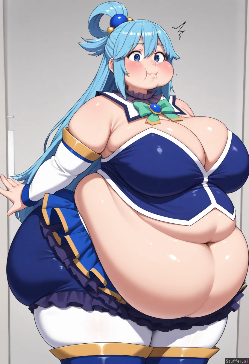 uhd, high resolution, flawless, best_quality, (hdr), (lineless:1.4), perfect anatomy, beautiful face, beautiful eyes, Tweedabop(artist), (ohasi_art), (betterwithsalt), w-oo-t(artist),(perfect hands). (((Solo))) (a surprised look) ((((fat, gigantic fat ass, fat belly, thick thighs, wide hips, puffy cheeks, weight again)))) ((aqua(konosuba))), Big breasts,cleavage, solo
