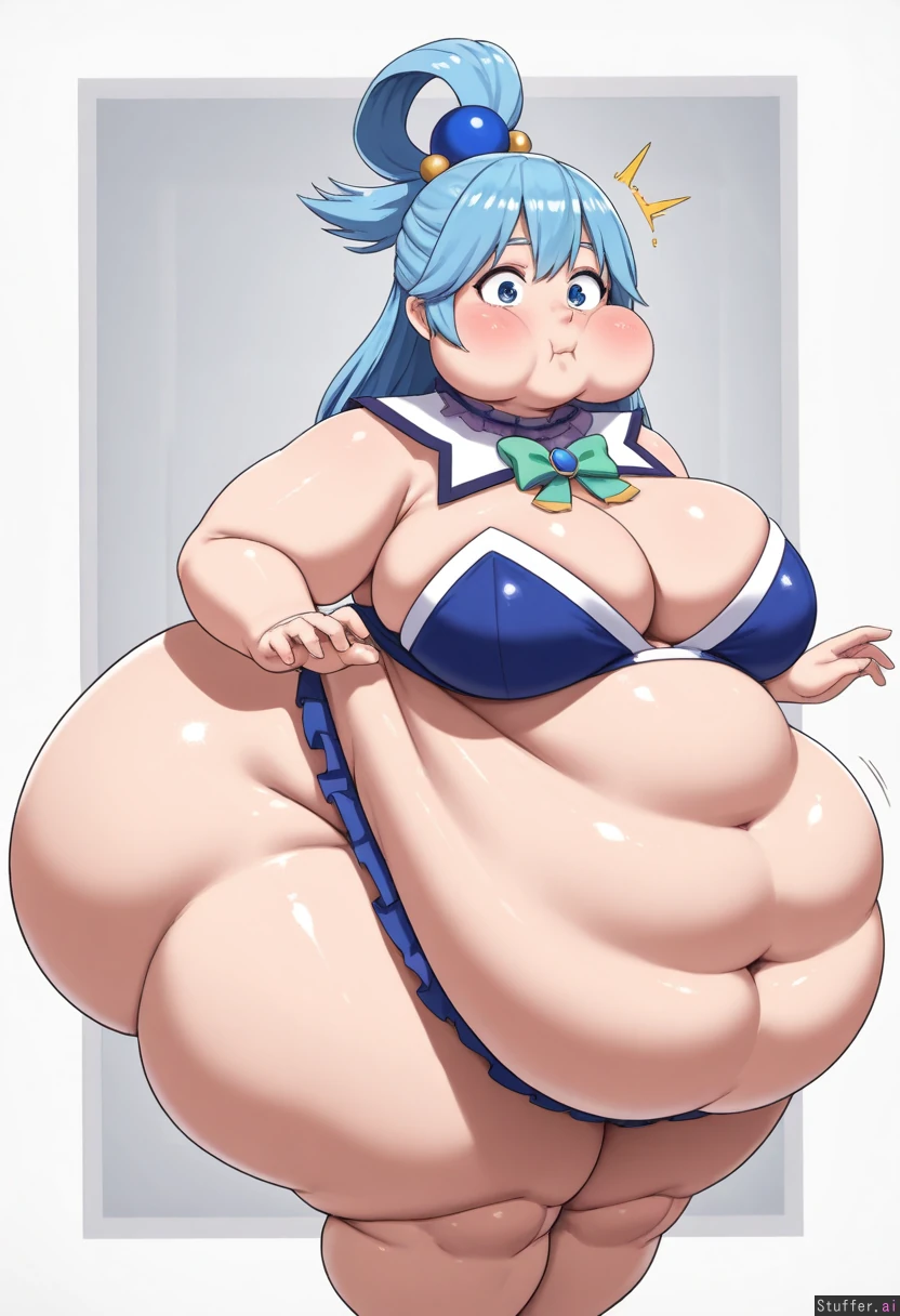 uhd, high resolution, flawless, best_quality, (hdr), (lineless:1.4), perfect anatomy, beautiful face, beautiful eyes, Tweedabop(artist), (ohasi_art), (betterwithsalt), w-oo-t(artist),(perfect hands). (((Solo))) (a surprised look) ((((fat, gigantic fat ass, fat belly, thick thighs, wide hips, puffy cheeks, weight again)))) ((aqua(konosuba))), Big breasts,cleavage, solo