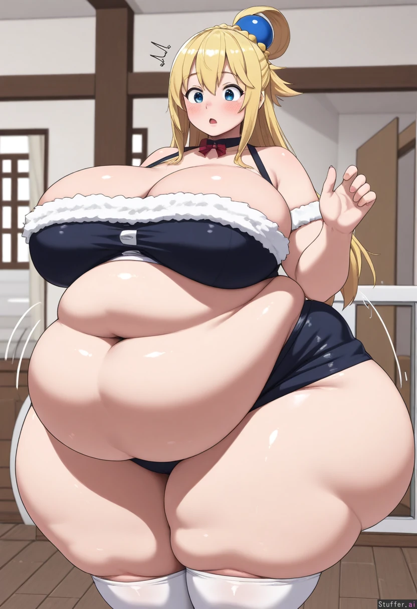uhd, high resolution, flawless, best_quality, (hdr), (lineless:1.4), perfect anatomy, beautiful face, beautiful eyes, Tweedabop(artist), (ohasi_art), (betterwithsalt), w-oo-t(artist),(perfect hands). (((Solo))) (a surprised look) ((((fat, gigantic fat ass, fat belly, thick thighs, wide hips, weight again)))) ((aqua(konosuba))), Big breasts,cleavage, solo