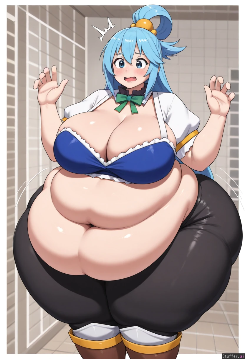 uhd, high resolution, flawless, best_quality, (hdr), (lineless:1.4), perfect anatomy, beautiful face, beautiful eyes, Tweedabop(artist), (ohasi_art), (betterwithsalt), w-oo-t(artist),(perfect hands). (((Solo))) (a surprised look) ((((fat, gigantic fat ass, fat belly, thick thighs, wide hips, weight again)))) ((aqua(konosuba))), cleavage, solo
