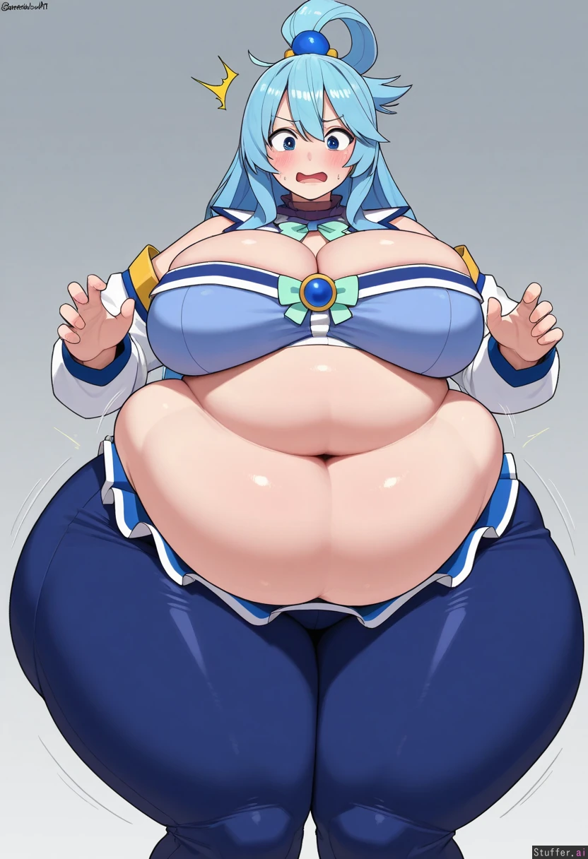 uhd, high resolution, flawless, best_quality, (hdr), (lineless:1.4), perfect anatomy, beautiful face, beautiful eyes, Tweedabop(artist), (ohasi_art), (betterwithsalt), w-oo-t(artist),(perfect hands). (((Solo))) (a surprised look) ((((fat, gigantic fat ass, thick thighs, wide hips, weight again)))) ((aqua(konosuba))), cleavage, solo