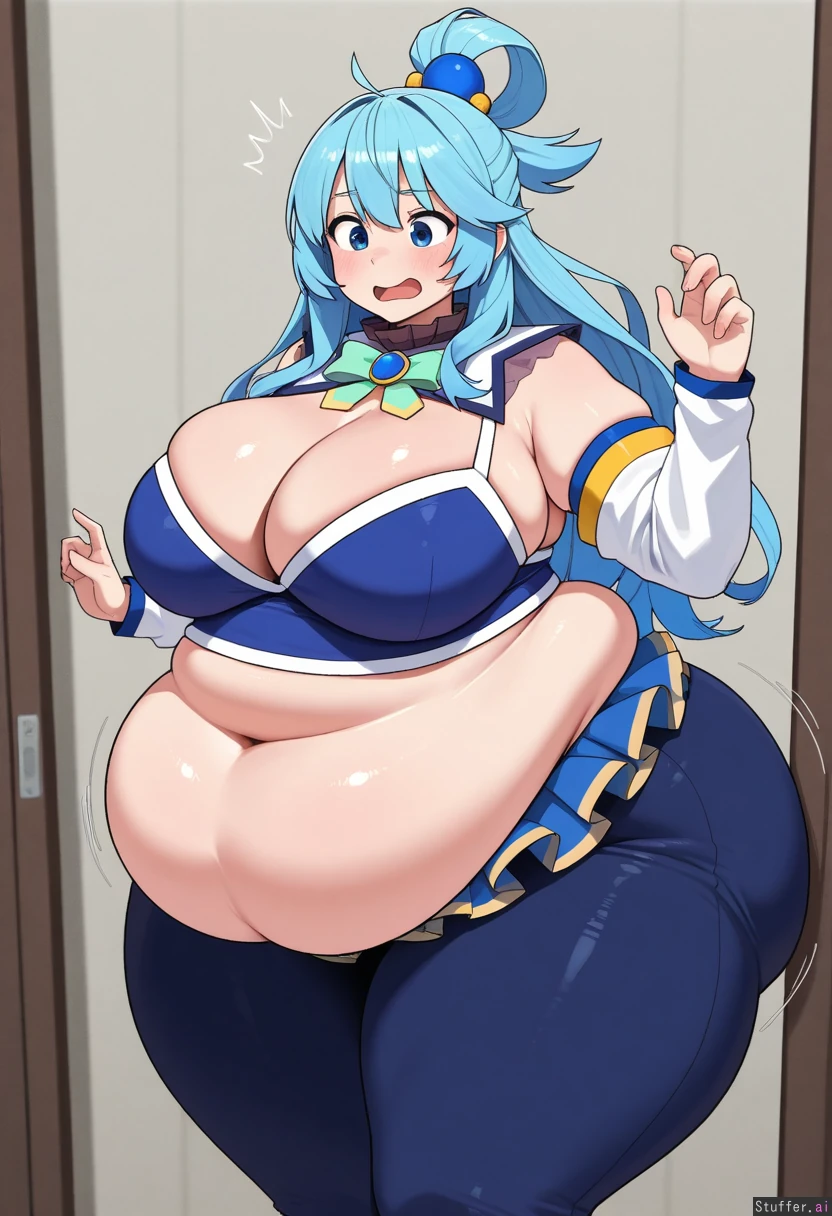 uhd, high resolution, flawless, best_quality, (hdr), (lineless:1.4), perfect anatomy, beautiful face, beautiful eyes, Tweedabop(artist), (ohasi_art), (betterwithsalt), w-oo-t(artist),(perfect hands). (((Solo))) (a surprised look) ((((fat, gigantic fat ass, thick thighs, wide hips, weight again)))) ((aqua(konosuba))), cleavage, solo