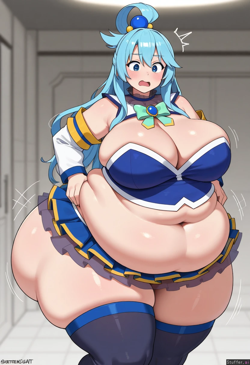 uhd, high resolution, flawless, best_quality, (hdr), (lineless:1.4), perfect anatomy, beautiful face, beautiful eyes, Tweedabop(artist), (ohasi_art), (betterwithsalt), w-oo-t(artist),(perfect hands). (((Solo))) (a surprised look) ((((fat, gigantic fat ass, thick thighs, wide hips, weight again)))) ((aqua(konosuba))), cleavage, solo