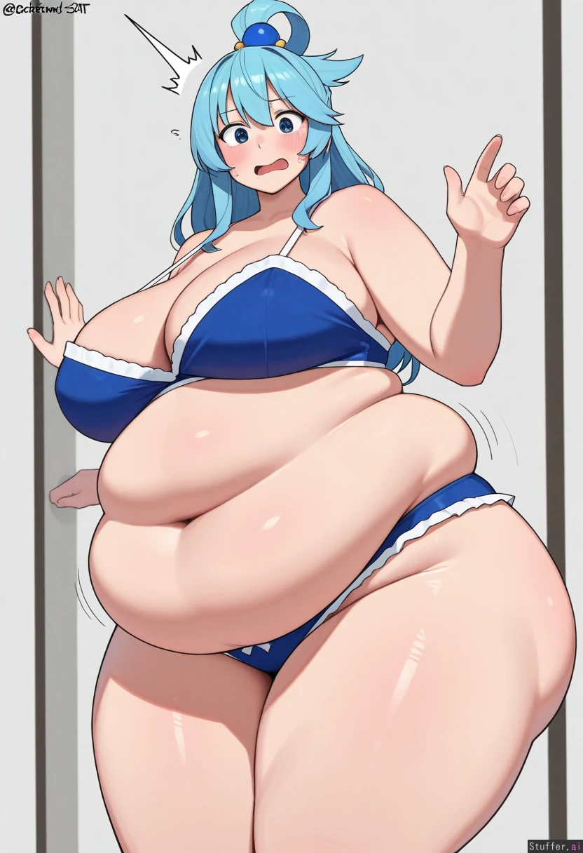 uhd, high resolution, flawless, best_quality, (hdr), (lineless:1.4), perfect anatomy, beautiful face, beautiful eyes, Tweedabop(artist), (ohasi_art), (betterwithsalt), w-oo-t(artist),(perfect hands). (((Solo))) (a surprised look) ((((fat, big fat ass, thick thighs, wide hips, weight again)))) ((aqua(konosuba))), cleavage, solo