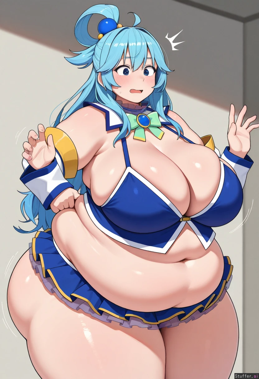 uhd, high resolution, flawless, best_quality, (hdr), (lineless:1.4), perfect anatomy, beautiful face, beautiful eyes, Tweedabop(artist), (ohasi_art), (betterwithsalt), w-oo-t(artist),(perfect hands). (((Solo))) (a surprised look) ((((fat, big fat ass, thick thighs, wide hips, weight again)))) ((aqua(konosuba))), cleavage, solo