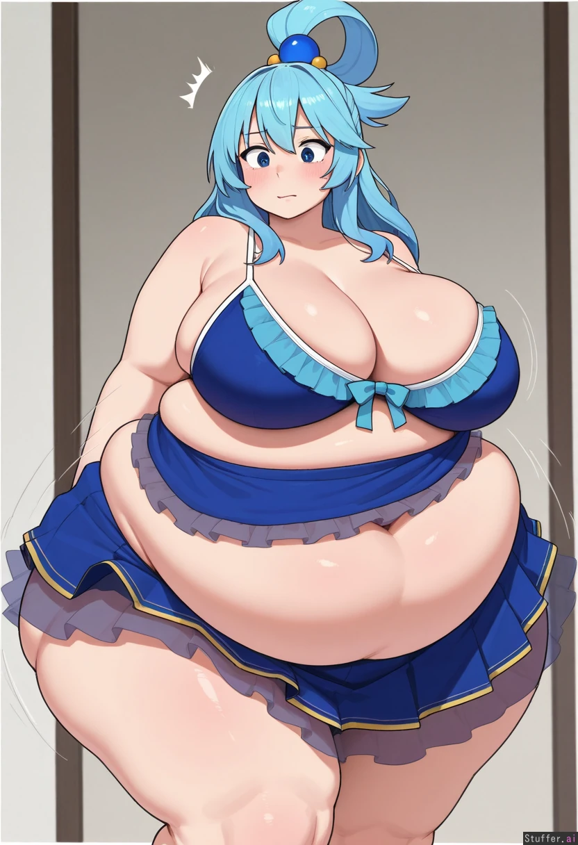 uhd, high resolution, flawless, best_quality, (hdr), (lineless:1.4), perfect anatomy, beautiful face, beautiful eyes, Tweedabop(artist), (ohasi_art), (betterwithsalt), w-oo-t(artist),(perfect hands). (((Solo))) (a surprised look) ((((fat, big fat ass, thick thighs, wide hips, weight again)))) ((aqua(konosuba))), cleavage, solo