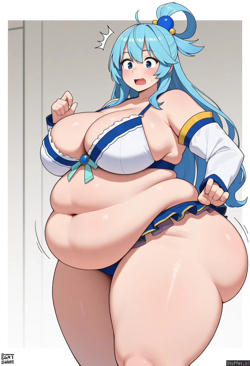 uhd, high resolution, flawless, best_quality, (hdr), (lineless:1.4), perfect anatomy, beautiful face, beautiful eyes, Tweedabop(artist), (ohasi_art), (betterwithsalt), w-oo-t(artist),(perfect hands). (((Solo))) (a surprised look) ((((fat, big fat ass, thick thighs, wide hips, weight again)))) ((aqua(konosuba))), cleavage, solo