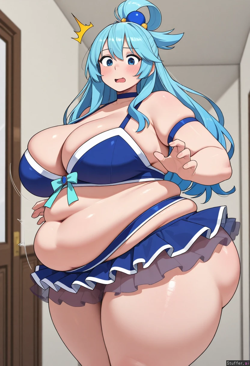 uhd, high resolution, flawless, best_quality, (hdr), (lineless:1.4), perfect anatomy, beautiful face, beautiful eyes, Tweedabop(artist), (ohasi_art), (betterwithsalt), w-oo-t(artist),(perfect hands). (((Solo))) (a surprised look) ((((fat, big fat ass, thick thighs, wide hips, weight again)))) ((aqua(konosuba))), cleavage, solo