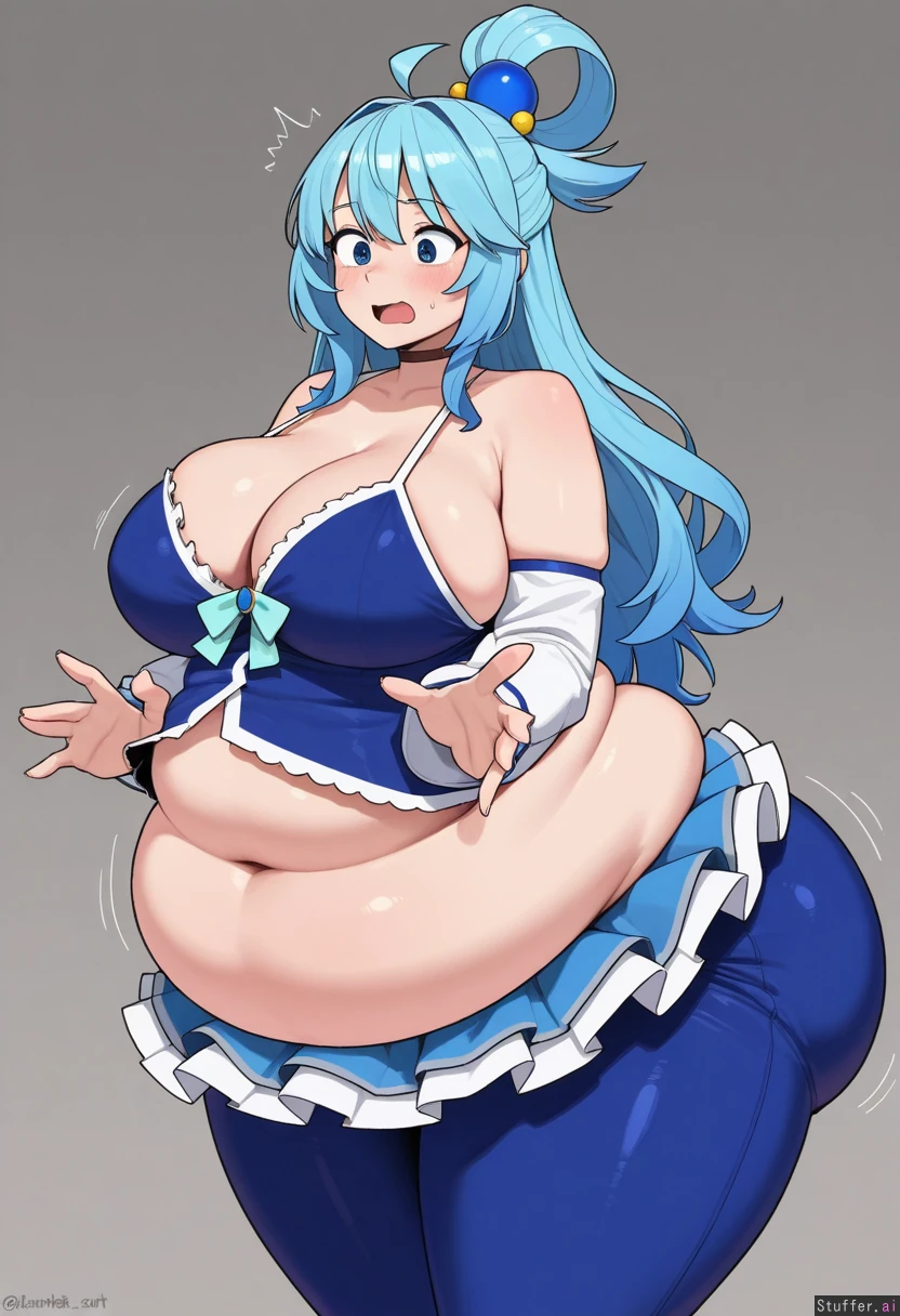 uhd, high resolution, flawless, best_quality, (hdr), (lineless:1.4), perfect anatomy, beautiful face, beautiful eyes, Tweedabop(artist), (ohasi_art), (betterwithsalt), w-oo-t(artist),(perfect hands). (((Solo))) (a surprised look) ((((fat, big fat ass, thick thighs, wide hips, weight again)))) ((aqua(konosuba))), cleavage, solo