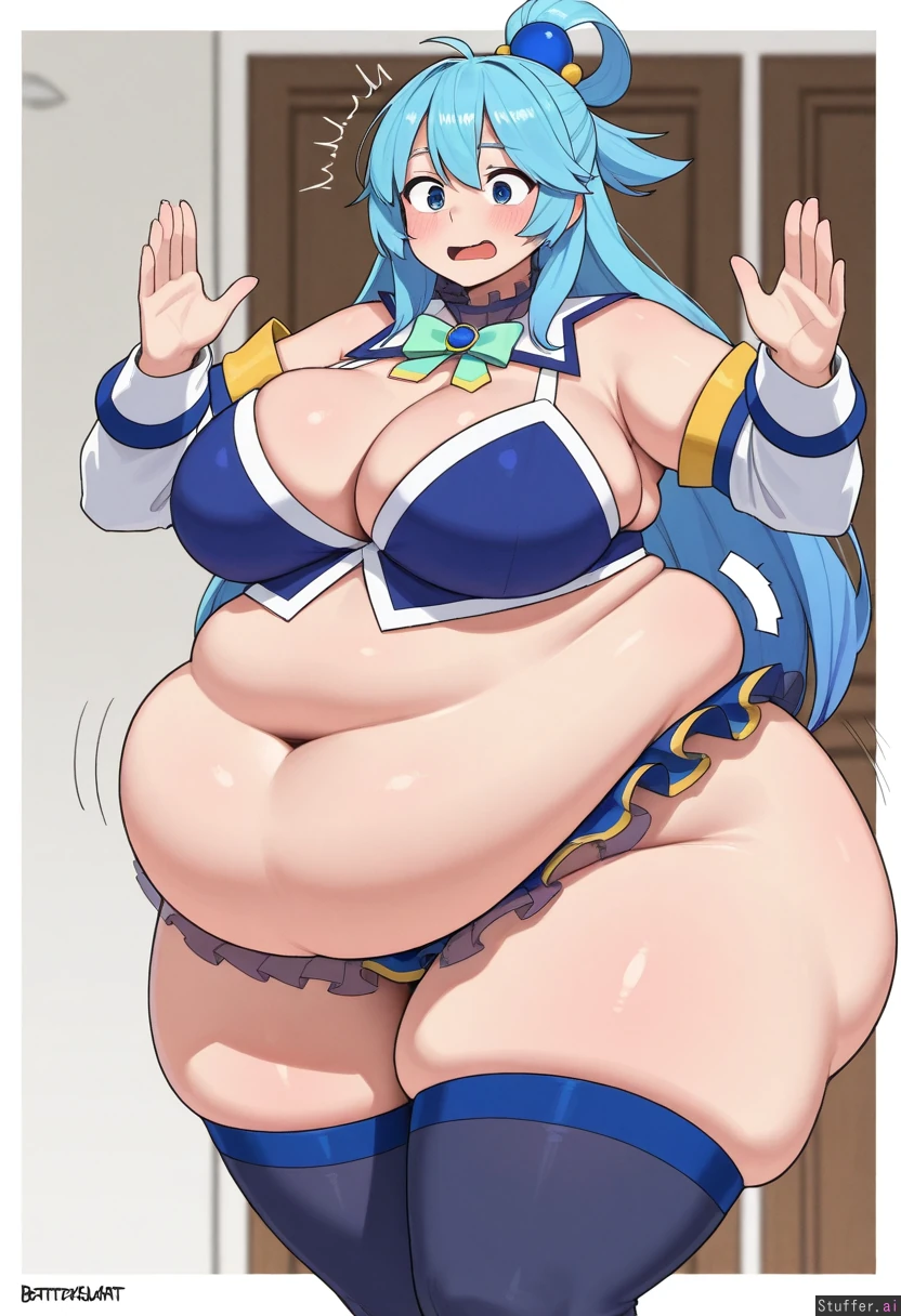 uhd, high resolution, flawless, best_quality, (hdr), (lineless:1.4), perfect anatomy, beautiful face, beautiful eyes, Tweedabop(artist), (ohasi_art), (betterwithsalt), w-oo-t(artist),(perfect hands). (((Solo))) (a surprised look) ((((fat, big fat ass, thick thighs, wide hips, weight again)))) ((aqua(konosuba))), cleavage, solo
