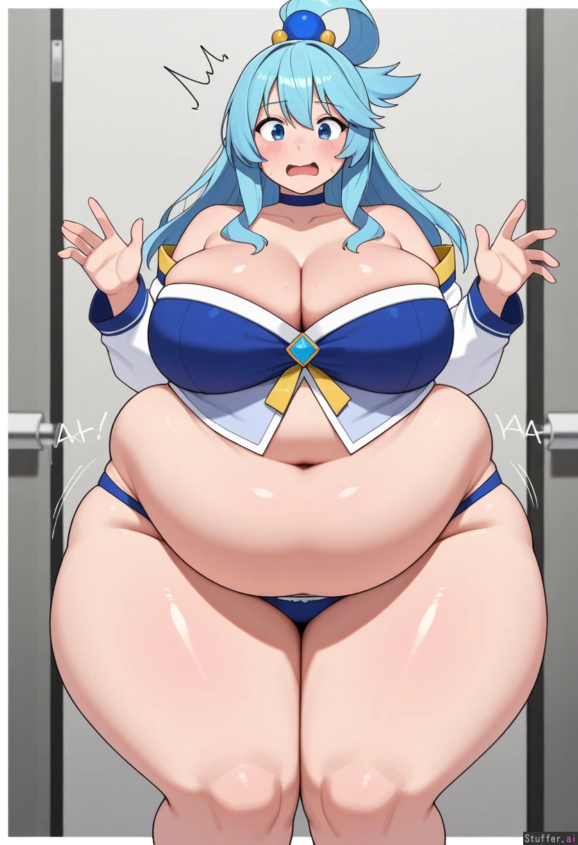 uhd, high resolution, flawless, best_quality, (hdr), (lineless:1.4), perfect anatomy, beautiful face, beautiful eyes, Tweedabop(artist), (ohasi_art), (betterwithsalt), w-oo-t(artist),(perfect hands). (((Solo))) (a surprised look) ((((fat, big fat ass, thick thighs, wide hips, weight again)))) ((aqua(konosuba))), cleavage, solo