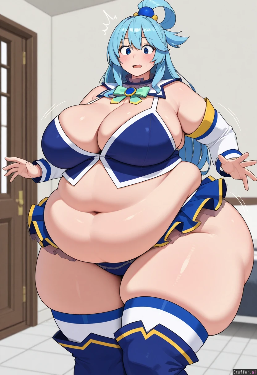 uhd, high resolution, flawless, best_quality, (hdr), (lineless:1.4), perfect anatomy, beautiful face, beautiful eyes, Tweedabop(artist), (ohasi_art), (betterwithsalt), w-oo-t(artist),(perfect hands). (((Solo))) (a surprised look) ((((fat, big fat ass, thick thighs, wide hips, weight again)))) ((aqua(konosuba))), cleavage, solo