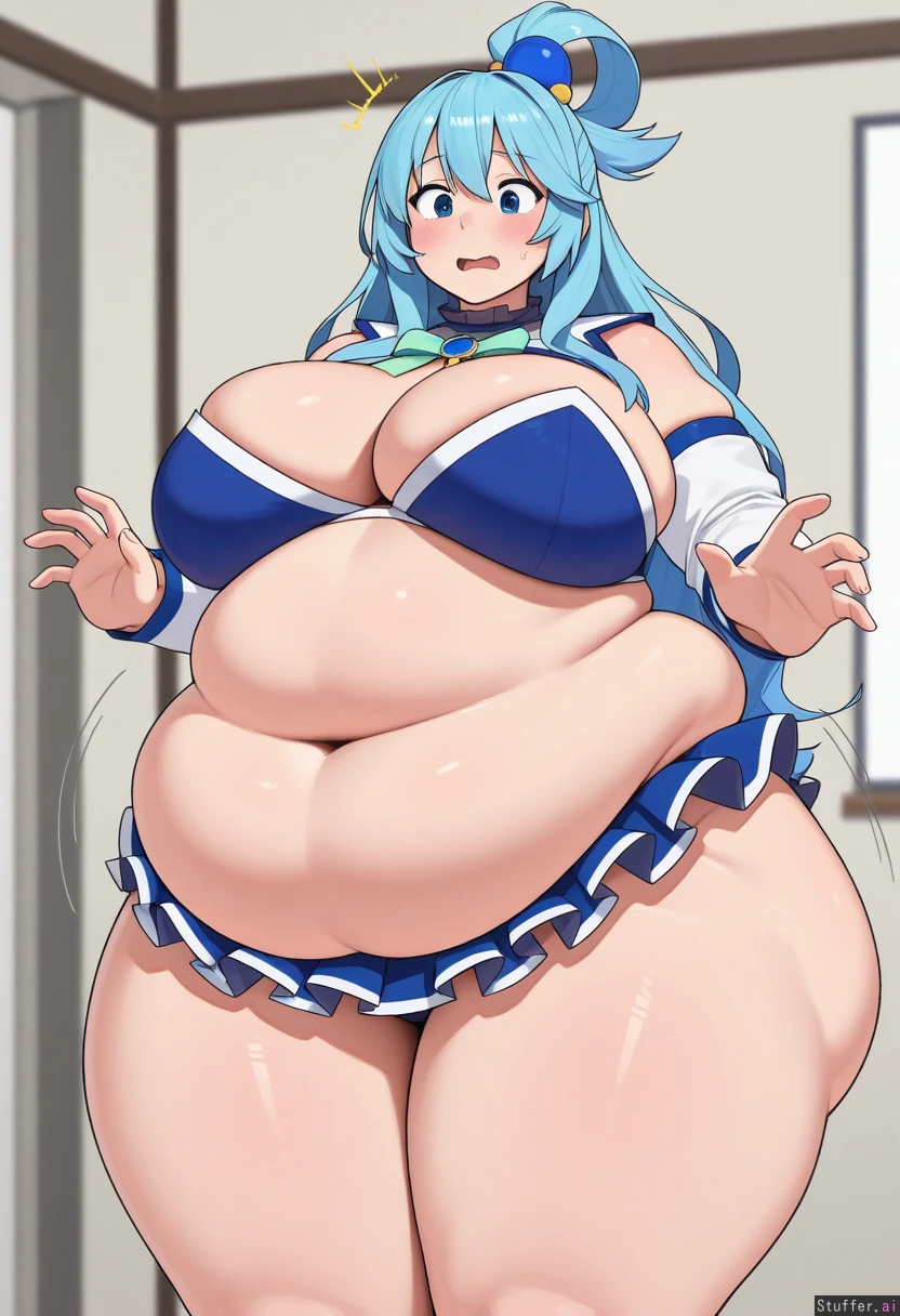 uhd, high resolution, flawless, best_quality, (hdr), (lineless:1.4), perfect anatomy, beautiful face, beautiful eyes, Tweedabop(artist), (ohasi_art), (betterwithsalt), w-oo-t(artist),(perfect hands). (((Solo))) (a surprised look) ((((fat, big fat ass, thick thighs, wide hips, weight again)))) ((aqua(konosuba))), cleavage, solo