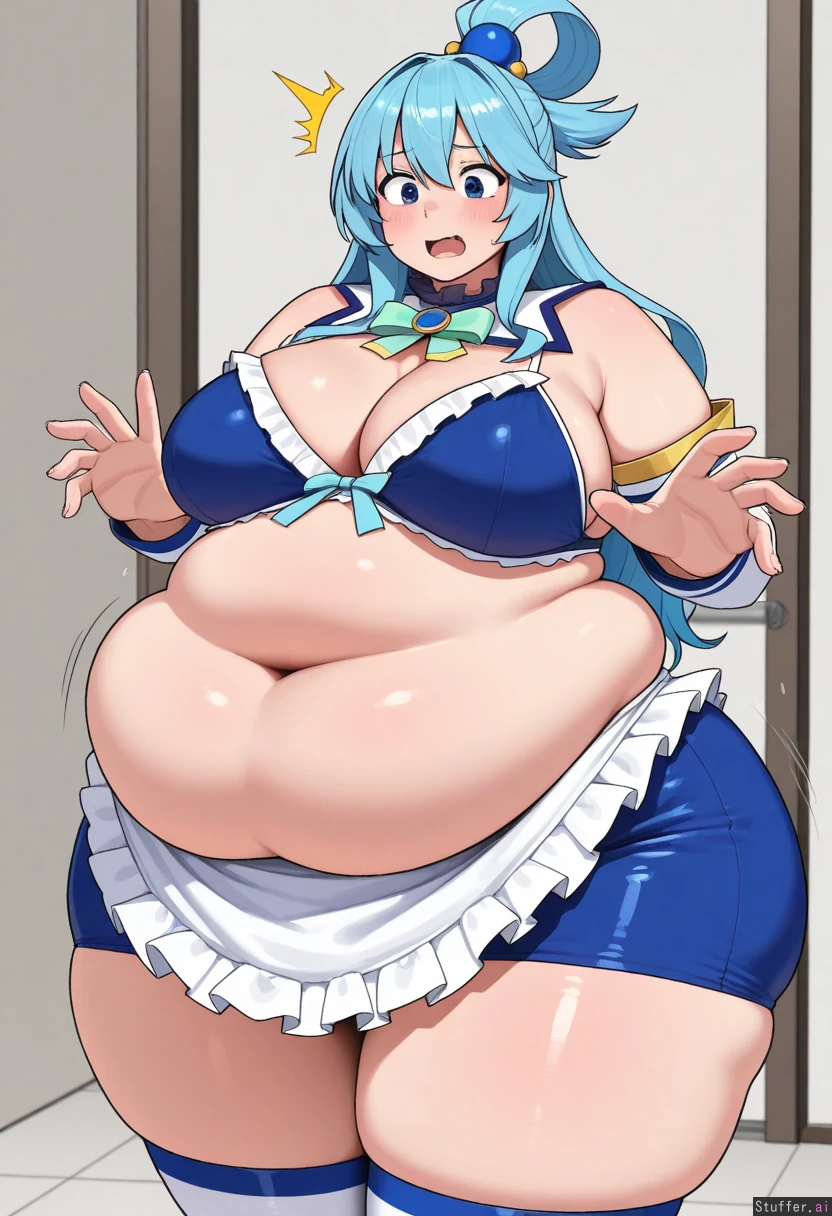uhd, high resolution, flawless, best_quality, (hdr), (lineless:1.4), perfect anatomy, beautiful face, beautiful eyes, Tweedabop(artist), (ohasi_art), (betterwithsalt), w-oo-t(artist),(perfect hands). (((Solo))) (a surprised look) ((((fat, big fat ass, thick thighs, wide hips, weight again)))) ((aqua(konosuba))), cleavage, solo