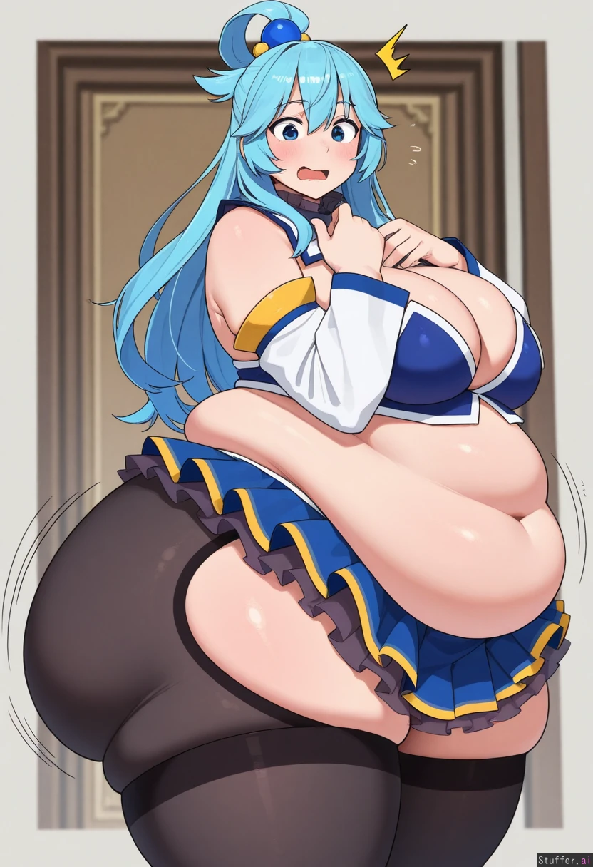 uhd, high resolution, flawless, best_quality, (hdr), (lineless:1.4), perfect anatomy, beautiful face, beautiful eyes, Tweedabop(artist), (ohasi_art), (betterwithsalt), w-oo-t(artist),(perfect hands). (((Solo))) (a surprised look) ((((fat, big fat ass, thick thighs, wide hips, weight again)))) ((aqua(konosuba))), cleavage, solo