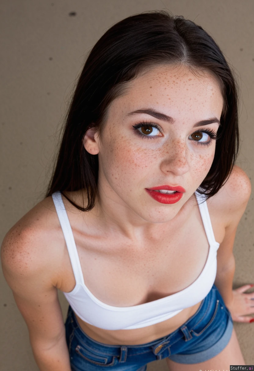 (Ultra HD), (perfect lighting) 1girl, fair_skin, long hair, dark_hair, perfect hair, 20 years old, tight tank top, tight denim shorts dark brown_eyes, blushing, light_freckles, red lipstick, eyeliner, eyeshadow, teeth slightly visible POV, looking up from ground Wide_shoulders, very_wide_hips, cleavage, skinny waist red nails, full_body